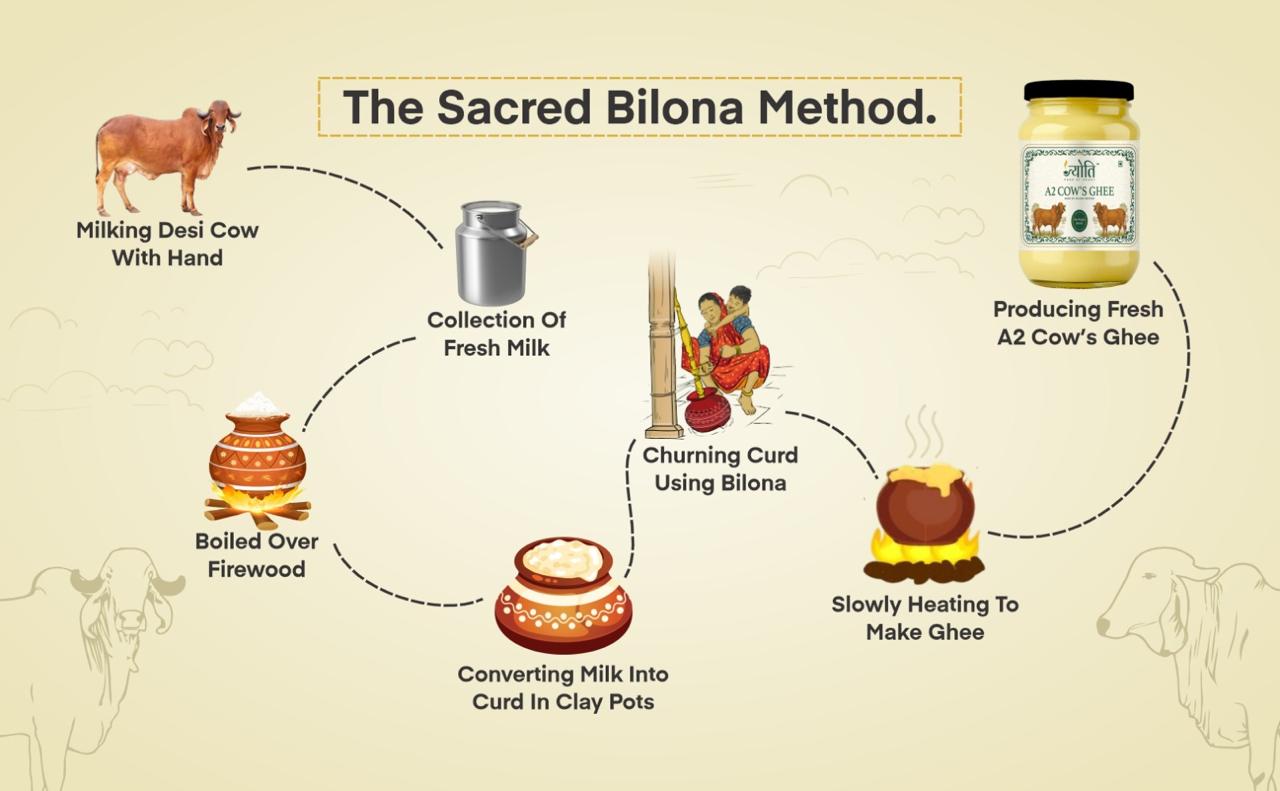 We follow a farm-to-home approach that ensures freshness and authenticity at every step. Our Gir cows are ethically raised and well-nurtured. The milk is hand-collected, naturally cultured into curd, and then slow-churned using the Bilona technique – entirely by hand, without machines. The result is small-batch, fresh ghee delivered straight to your doorstep.