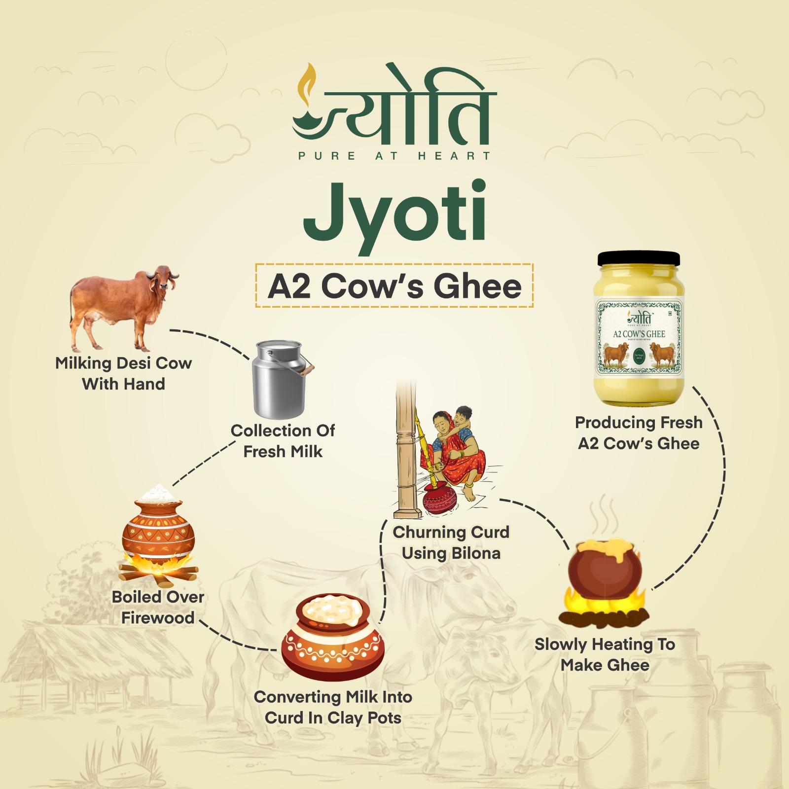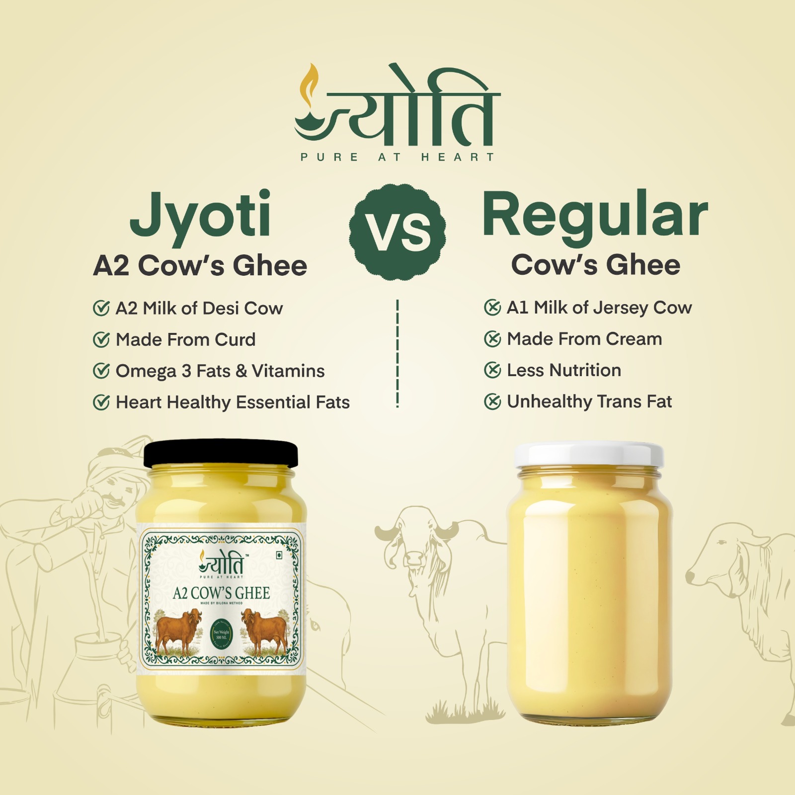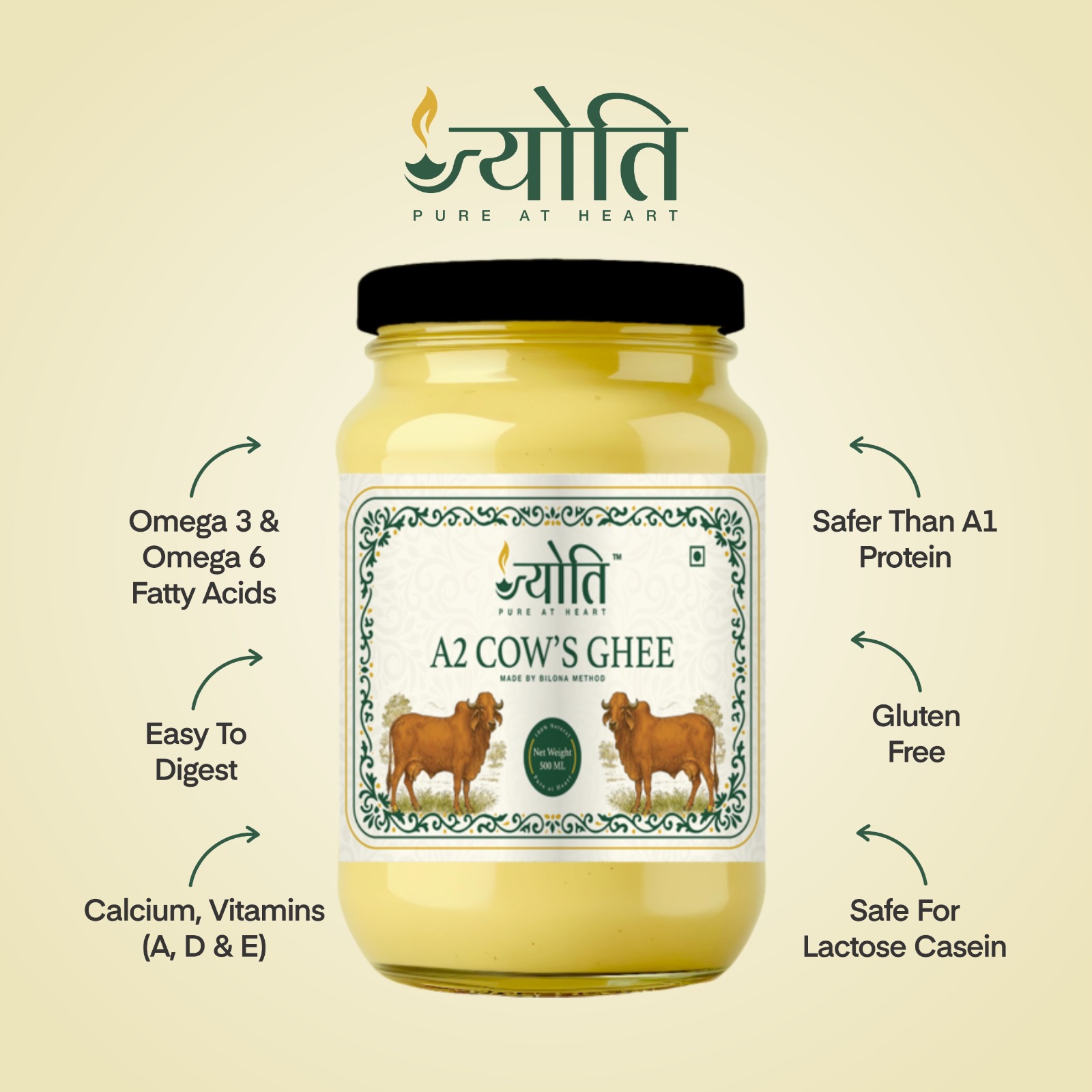 • 🌀 Authentic Bilona Method: Jyoti Pure at Heart A2 Cow’s Ghee is traditionally prepared using the hand-churned Bilona process from cultured curd, ensuring superior taste, rich aroma, and maximum nutrition, just like homemade desi ghee.